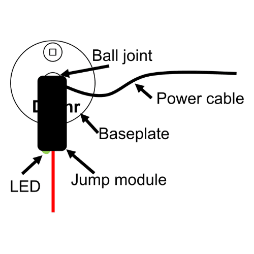 - Attach the Jump module to the ball joint by screwing them together. Loosen the ball joint to orient the Jump module so that the LED is pointing towards the ground – then gently tighten up the ball joint.