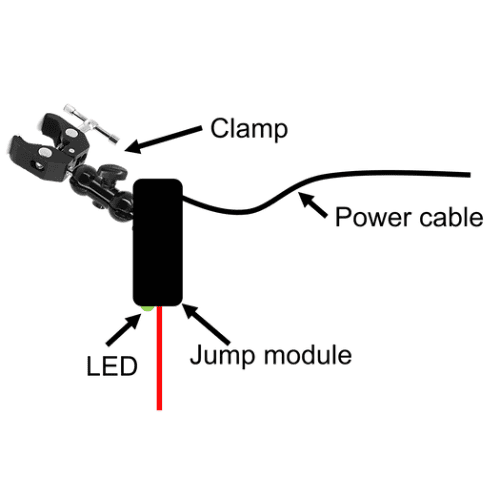 - Connect the power cable to the Jump module along with the USB extension cable. Later this will be plugged into your battery.