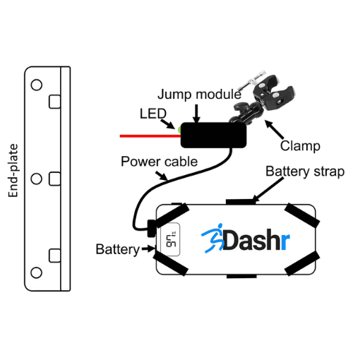 - Connect the power cable to the wingspan Jump module. Plug this cable into one of the USB ports on the Dashr battery. Locate the USB cord from the height/reach Jump module and connect that to the other USB port.
